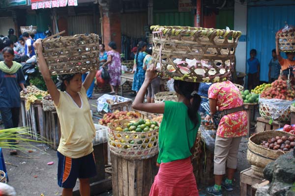 Ni Ketut Dewi, perempuan 17 tahun ini sedang hamil lima bulan ketika Ia berebutan dengan buruh tukang suun lainnya di Pasar Badung, Selasa (7/12) dini hari. Tiap satu jam, Ia menjunjung belasan sampai puluhan kilogram barang belanjaan pembeli dengan keranjang di atas kepala.