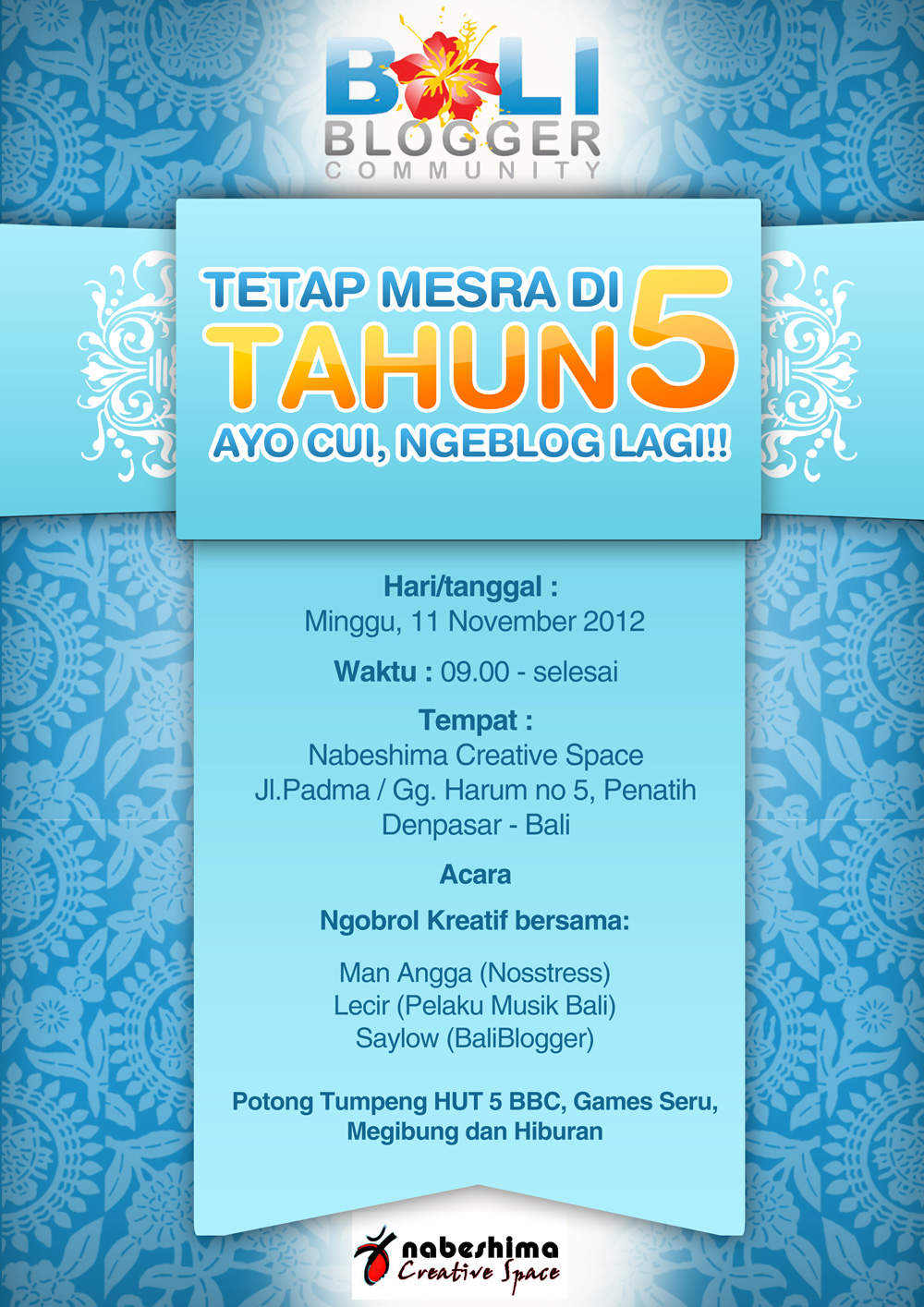 Nabeshima Creative Space (NCS) saya kenal ketika Aliansi Jurnalis Independen (AJI) Denpasar membuat program apresiasi jurnalis budaya bekerja sama dengan Arti Foundation, pendiri tempat itu. Nabeshima, nama yang digunakan juga familiar karena pernah meliput prosesi ngaben untuk almarhum Mari Nabeshima yang meninggal karena demam berdarah.
